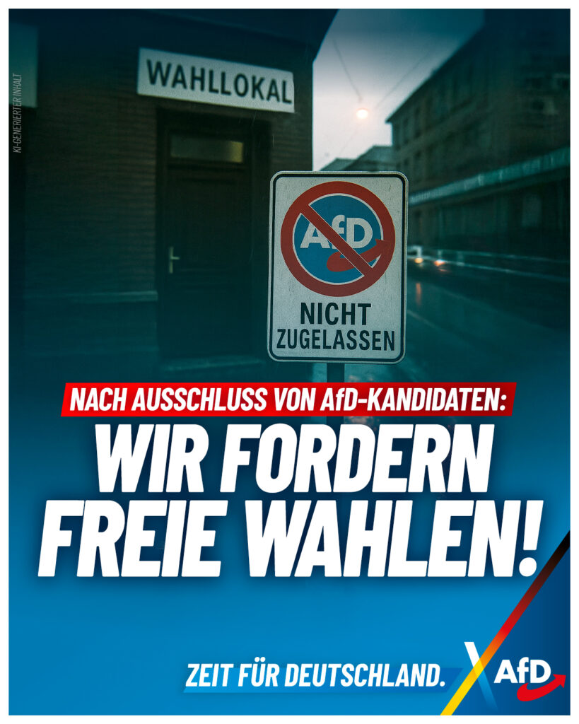 Eine AfD-Regierung wird diesem Treiben ein Ende bereiten! Wir werden wieder für wirklich demokratische Wahlen sorgen – ohne den Ausschluss unliebsamer Kandidaten. Auch den Verfassungsschutz werden wir entpolitisieren. Unsere Demokratie lassen wir uns nicht stehlen. Wir fordern freie Wahlen!