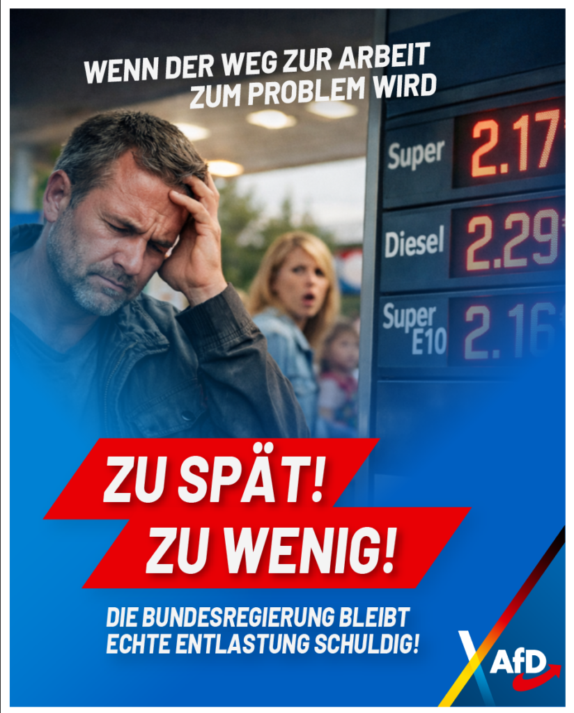 Die AfD fordert bereits seit Wochen die Senkung der Energie- und Mehrwertsteuer, die vollständige Abschaffung der CO2-Abgabe und darüber hinaus die Erhöhung der Pendlerpauschale und des Grundfreibetrages auf 15.000 Euro. Nur so kann eine breite Entlastung für Pendler, Familien, Rentner, Handwerk und Mittelstand erreicht werden. Während CDU und SPD erst jetzt auf den öffentlichen Druck reagieren, arbeitet die AfD strategisch.“